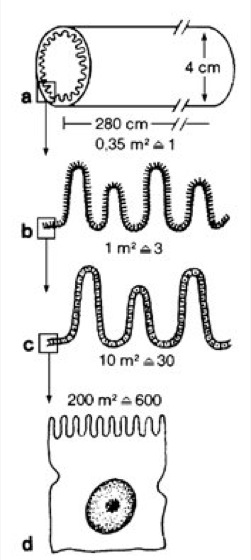 Oberflächenvergrößerung des Dünndarms durch vielfache "Auffältelung". Betrachtet man ein Stück des Dünndarms von 4 cm Durchmesser und 280 cm Länge (a) als Zylinder (Oberfläche ca. 0,35 m2