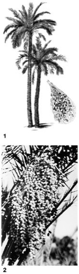 Dattelpalme [von griech. daktylos = Dattel], Phoenix, Gattung der Palmen mit 13 Arten, die sich durch Fiederblätter mit V-förmig gestellten Fiedern auszeichnen. Die Blüten sind diözisch verteilt, aus den 3 getrennten Fruchtknoten entwickelt sich meist nur eine einsamige Einblattbeere mit fleischigem Mesokarp und hautartigem Endokarp. Die wichtigste der Arten ist die Echte Dattelpalme, Phoenix dactylifera ( vgl. Abb. ), die die auch bei uns bekannten eßbaren Datteln liefert. Sie wird seit mindestens 8000 Jahren als Kulturpflanze angebaut; ihre Abstammung ist nicht sicher geklärt. Der bis 20 m hohe Schaft ist mit den Basen abgeworfener Blätter bedeckt und besitzt einen endständigen Schopf von bis zu 4 m langen Fiederblättern. Die rispigen Blütenstände, von je 2 Hochblättern umhüllt, entstehen in den Blattachseln. Die Blütenstände tragen ca. 500 Blüten (von denen die Hälfte entfernt wird), die sich daraus entwickelnden Beeren ( vgl. Abb. ) umschließen einen harten länglichen Samen, der als Reservestoff Cellulose enthält. Der Pollen der noch vielblütigeren ♂ Blütenstände wird durch den Wind übertragen. Da sehr viel weniger ♂ als ♀ Bäume angepflanzt werden, wird die Bestäubung meist dadurch gesichert, daß man Teilinfloreszenzen in die ♀ Bäume hängt. Die ♂ Blütenstände, deren Pollen wochenlang keimungsfähig bleiben, sind wichtige Handelsobjekte. Die Vermehrung der Dattelpalme erfolgt vorwiegend vegetativ, um nicht unnötig viele ♂ Pflanzen aufzuziehen. Die bis zu 200 Jahre alt werdende Dattelpalme stellt hohe Ansprüche an die Wasserversorgung und gedeiht bei mittleren Temperaturen um 30 °C. Sogenannte Saftdatteln, deren Stärke bei der Reife in Zucker umgewandelt wird, werden vor allem exportiert. Die getrockneten Früchte sind wegen ihres hohen Zuckergehalts von über 50% sehr lange haltbar. Wichtig als Nahrungsgrundlage in Nordafrika und den Trockengebieten Südwestasiens sind die Trockendatteln, deren Stärke nicht umgewandelt wird (Inhaltsstoffe vgl. Tab. ). 1994 wurden insgesamt 3,9 Millionen Tonnen Datteln produziert (vor allem in arabischen Staaten; vgl. Tab. ). – Ebenfalls von Bedeutung ist Phoenix sylvestris, die als Ahnform von Phoenix dactylifera in Frage kommt. Aus dem Stamm dieser in Indien beheimateten Art kann durch Anritzen ein zuckerhaltiger Saft gewonnen werden; die Früchte jedoch sind ungenießbar. Dies gilt auch für die auf den Kanarischen Inseln beheimatete, bis 15 m hohe Phoenix canariensis, die kleine, eichelartige, orangegelbe Früchte besitzt. Phoenix theophrasti kommt nur auf Kreta vor. Afrika, Gleditsch (J.G.), Oase, Obstbau; Kulturpflanzen VI, Mediterranregion IV.