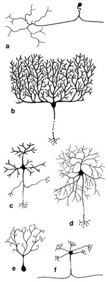 Verschiedene Nervenzelltypen (unterbrochene Linien stehen für Axone): a primäre sensorische Nervenzelle im Spinalganglion, b Purkinje-Zelle, c Pyramidenzelle, d Sternzelle, e amakrine Zelle, f Körnerzelle