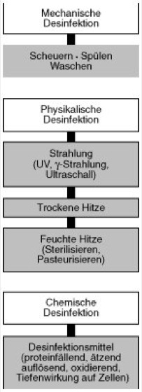 Lit.: Bodenschatz, W. (Hrsg.): Desinfektion. Sterilisation, Reinigung, Schädlingsbekämpfung, Rechtsvorschriften und Materialien. Loseblattausgabe. Stuttgart 1998 ff. Junghanns, U., Steuer, W.: Sterilisation und Desinfektion im Krankenhaus. Essen 1991. Krischy, Usemann (Hrsg.): Desinfektion von Trinkwasser. München 1999. Steuer, W., Lutz-Dettinger, U., Schubert, F.: Leitfaden der Desinfektion, Sterilisation und Entwesung. Stuttgart 71997. Wallhäuser, K.H.: Praxis der Sterilisation, Desinfektion, Konservierung. Keimidentifizierung, Betriebshygiene. Stuttgart 51995.
