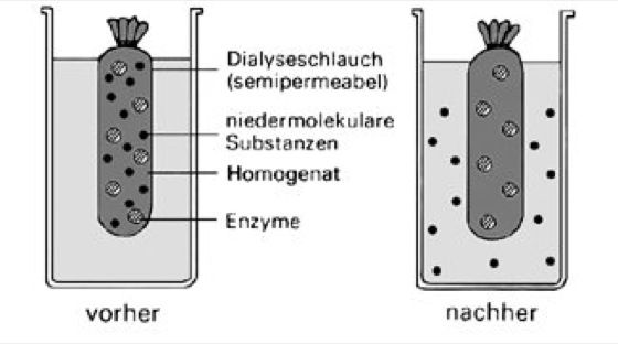 Die Metaboliten diffundieren durch eine halbdurchlässige (semipermeable) Membran zu Orten niedrigerer Konzentration. Durch öfteres Wechseln des äußeren Mediums kann erreicht werden, daß im Dialyseschlauch nur noch die hochmolekularen Stoffe, d. h. die gesamte Enzymausstattung, zurückbleibt.