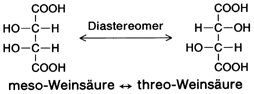 Diastereoisomere, Diastereomere, allo-Isomere, Stereoisomere (Isomerie) eines Moleküls, die nicht Enantiomere sind, sich also nicht wie Bild und Spiegelbild zueinander verhalten (z. B. meso- und threo-Weinsäure; vgl. Abb. ). Sie besitzen unterschiedliche physikalische und ähnliche, jedoch nicht gleiche chemische Eigenschaften.