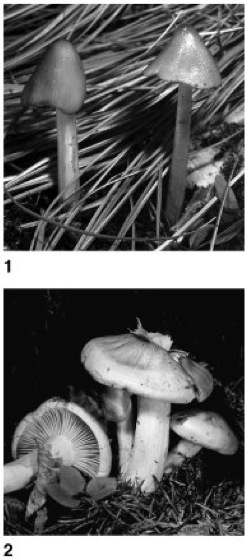1 Hygrocybe amoena (Schöner Saftling), 2 Hygrophorus erubescens (Rasiger Purpurschneckling)