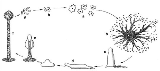 Dictyostelium Entwicklungszyklus und Morphogenese von Dictyostelium discoideum Sobald die Nahrung knapp wird, kriechen die Amöben (a = Vermehrungsphase der frei lebenden Amöben) zusammen (Aggregation, b). Das Aggregat (Pseudoplasmodium) mit bis zu 105 Zellen bildet einen etwa 1 mm großen, senkrecht vom Substrat abstehenden Conus (c), der Polarität aufweist und – sobald er umkippt – auf dem Substrat herumkriecht (Migrationsphase, d). In diesem Stadium findet eine Differenzierung der Zellen in Vorsporenzellen, Vorstielzellen (etwa 20% der Gesamtzellen) sowie zukünftige Zellen der Basis statt, wobei sowohl Zellsortierungs- bzw. -gruppierungsmechanismen als auch Zellspezifizierung durch Positionssignale (z. B. Morphogengradienten) eine Rolle spielen. Die Fortbewegung des Conus geht mit Zellwanderungs- und Differenzierungsvorgängen Hand in Hand: An der Spitze des Conus befinden sich Vorstielzellen, die im Innern nach hinten wandern; in den Außenbereichen der Conusspitze werden die Vorstielzellen durch Zellen ersetzt, die von Vorsporenzellen abstammen. Schließlich bildet der Zellverband einen Sporenträger (Sporangiophor) mit Basalscheibe, Stiel und endständiger Sporenmasse (Kulmination, e–f). Die ausdifferenzierten Sporenzellen werden angehoben, indem die Stielzellen an der Spitze durch die Sporenmasse hindurch nach unten wandern (stellt prinzipiell die Fortführung der Zellbewegungen der Migrationsphase dar). Die Stielzellen bilden Vakuolen sowie dicke Zellwände aus Cellulose und sterben ab, die Sporenzellen fallen auseinander (g) und können vom Wind verdriftet werden. Aus ihnen keimen, wenn sie geeignetes Substrat erreichen, wieder typische Amöben (h). Die Aggregation der Einzelindividuen erfolgt unter dem Einfluß von cAMP (vor seiner Identifizierung als Acrasin bezeichnet). Zusammen mit einem differenzierungsinduzierenden Faktor (DIF), der als chloriertes Hexaphenon charakterisiert wurde, vermittelt cAMP außerdem die Differenzierung von Sporen- und Stielzellen. Eine hohe cAMP-Konzentration aktiviert z. B. Proteinkinasen (PKA), die einen Inhibitor phosphorylieren, der die Stielzellgene kontrolliert. Dadurch werden die Stielzellbildung und Kulmination ausgelöst. |