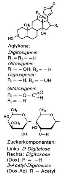 Digitalisglykoside [von *digi -], eine Gruppe von herzwirksamen Glykosiden aus Fingerhut-(Digitalis-)Blättern (Fingerhut), deren Aglykone (Digitoxigenin,Digoxigenin, Gitoxigenin und Gitaloxigenin) dem Cardenolid-Typ (Cardenolide) angehören ( vgl. Tab. ). In den Zuckeranteilen, die über die Hydroxylgruppe in Position 3 der Aglykone ( vgl. Abb. ) gebunden und untereinander β-glykosidisch verknüpft sind, treten D-Glucose, D-Digitoxose, D-Digitalose und 3-Acetyl-Digitoxose auf. Hauptglykoside von Digitalis purpurea (Roter Fingerhut; dessen pharmakologische Wirkung wurde 1778 erstmals von W. Withering beschrieben), aus dem bisher über 30 Digitalisglykoside isoliert wurden, sind die Purpureaglykoside A und B (ca. 60%), Digitoxin (12%), Gitoxin (ca. 10%) und Gitaloxin (ca. 10%), von denen jedoch nur Digitoxin heute noch therapeutische Bedeutung besitzt. Weiterhin sind im Roten Fingerhut zwei Gruppen von herzunwirksamen Glykosiden enthalten: die Digitanolglykoside (Pregnanglykoside), denen der Lactonring fehlt, mit den Vertretern Diginin, Digipurpurin und Digifolein, sowie die Spirostanolglykoside (Saponine), zu denen Digitonin, Gitonin und Tigonin zählen. Unter den (bisher über 60) Digitalisglykosiden aus Digitalis lanata (Wolliger Fingerhut) sind die Hauptvertreter Lanatosid A und C (ca. 50%), wobei Lanatosid A vorwiegend in jungen, Lanatosid C mehr in älteren Blättern zu finden ist. Therapeutisch wichtig sind vor allem Digoxin, Acetyl-Digoxin und Lanatosid A, B und C. Die therapeutische Wirkung dieser Digitalisglykoside beruht auf einer Hemmung der Na+-K+-ATPase (aktiver Transport), was zu einem höheren Na+-Spiegel in der Zelle führt. Dies wiederum vermindert das Ausströmen von Ca2+ über den Na+/Ca2+-Austauscher (Calciumkanäle), und die erhöhte Ca2+-Konzentration fördert die Kontraktion des Herzmuskels. Die Dosierung ist allerdings schwierig; leicht erhöhte Mengen können bereits zu lebensgefährlichen Herzrhythmusstörungen führen. Digitalisglykoside dämpfen zudem das sympathische Nervensystem und senken die Konzentration von Renin und Aldosteron, was zu einer Verminderung des Blutdrucks und der verstärkten Ausscheidung von Salzen und Wasser führt, wodurch das Herz entlastet wird. Convallariaglykoside, Herzglykoside, Pflanzengifte, Schmiedeberg (O.), Schoenlein (J.L.), Straub (W.).