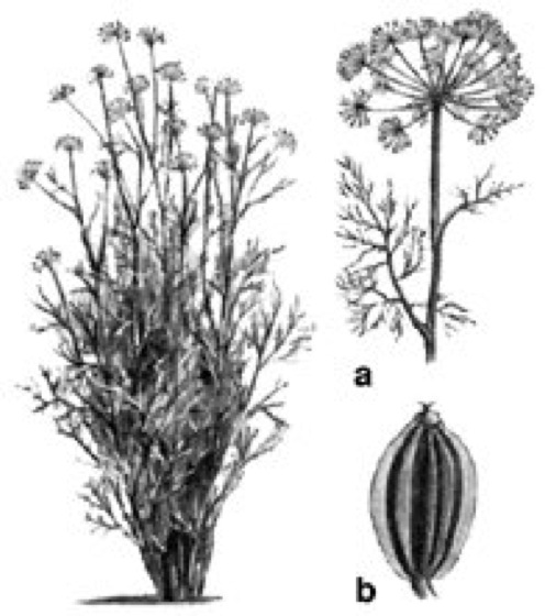 Echter Dill, Gurkenkraut (Anethum graveolens), a Blütendolde, b Frucht