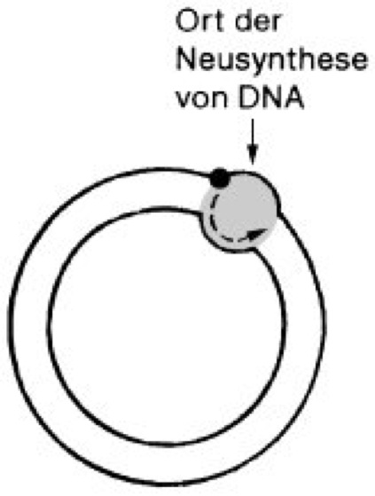 displacement loop (graue Zone, hier Ort der Neusynthese von DNA) zu Beginn der Replikation eines mitochondrialen oder plastidären DNA-Moleküls