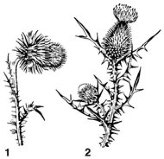1 Nickende Distel (Carduus nutans), 2 Krause Distel (Carduus crispus)