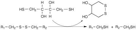 Dithiothreitol s, Substanz ( vgl. Abb. ), die neben Mercaptoethanol zur Reduktion von Disulfidbindungen bei der Denaturierung von Proteinen verwendet wird. Bei dieser Reaktion geht das lineare Dithiothreitol in eine cyclische Verbindung über. Das gleiche gilt für dessen Stereoisomeres (Enantiomere), das Dithioerythritol.
