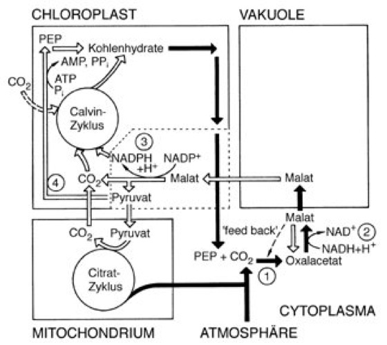 Reaktionen im diurnalen Säurerhythmus; beteiligte Enzyme: 1 Phosphoenolpyruvat-Carboxylase, 2 NAD+-abhängige Malat-Dehydrogenase, 3 decarboxylierende Malat-Dehydrogenase ("malic enzyme": bei C4-Pflanzen im Chloroplasten lokalisiert, bei CAM-Pflanzen im Cytoplasma), 4 Pyruvat-Phosphat-Dikinase