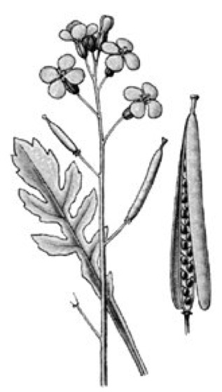 Mauersenf (Diplotaxis muralis, rechts Schote); Vorkommen in Hackfruchtäckern und Weinbergen sowie auf Schutt und Mauern