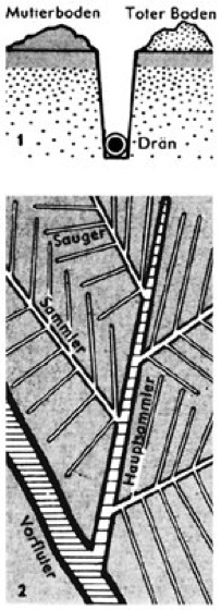 Dränung, Drainage, Bezeichnung für die Bodenentwässerung und die dazugehörige entsprechende Anlage ( ä vgl. Abb. ). Durch Dränung sollen die für Kulturpflanzen schädliche Bodennässe (Bodenwasser) beseitigt, das Bodengefüge verbessert und die Durchlüftung und Erwärmung des Bodens gefördert werden (Melioration). In 80–180 cm Tiefe befindet sich ein System von Dräns, wie z. B. perforierte Kunststoffwellrohre, gelochte Betonröhren und Faschinen. Das Wasser tritt durch die Fugen in die Dräns ein, fließt durch Sauger in Sammler und von dort in Vorfluter. Je nach Bodenart, Gefälle, abzuführender Wassermenge und Tiefenlage der Rohre beträgt die Entfernung der Sauger zwischen 10 und 25 m. Die Dränung ist eine der Hauptursachen für den Rückgang von Feuchtstandorten, z. B. Nieder-Mooren (Caricetalia nigrae) und der daran gebundenen Tier- und Pflanzenarten (Artenschutz).