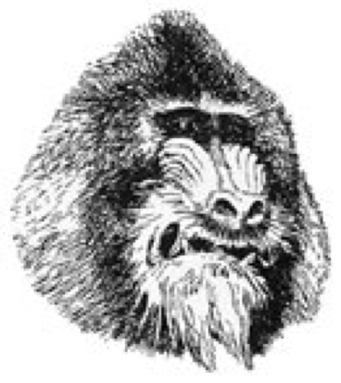 1 Drohmimik beim Mandrill: typisch die herabgezogenen Lippenwinkel und das Zeigen der Eckzähne; 2 Waldohreule (Asio otus) in Drohstellung