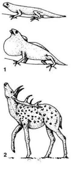 2 Hirsche (hier ein Dybowskihirsch) drohen wie ihre Vorfahren mit den Eckzähnen, obwohl diese zu winzigen Gebilden verkümmert sind. Die stammesgeschichtlich primitivsten Hirscharten (Moschustiere, Wasserrehe) besitzen noch große Eckzähne, die dem Rivalenkampf dienen. Die stammesgeschichtlich weiterentwickelten Formen wie der Rothirsch benutzen in Rivalenkämpfen nur das Geweih. Ihre Drohgebärde besteht also im Vorzeigen einer nicht mehr existierenden Waffe; die Verhaltenskoordination war stammesgeschichtlich stabiler als das zugehörige Körperorgan.
