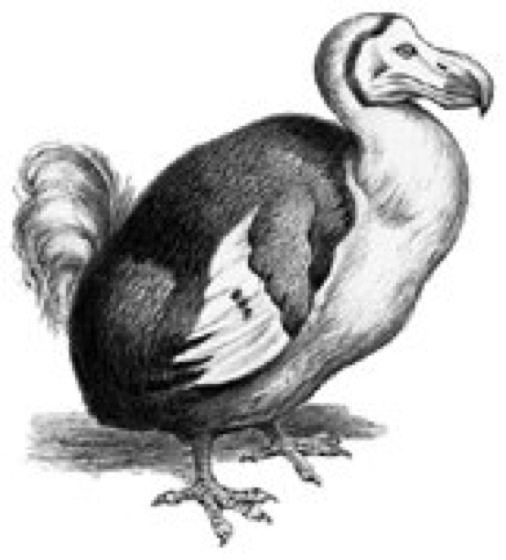 Drontevögel, Raphidae, flugunfähige, ausgestorbene Vögel von Schwanengröße, wahrscheinlich zu den Taubenvögeln gehörend; 3 Arten auf Inseln bei Madagaskar, wo sie ab 1680 bis spätestens zum Beginn des 19. Jh. einerseits durch jagende Seefahrer, andererseits durch eingebürgerte Ratten und Schweine, welche die Bodennester plünderten, ausgerottet wurden. Der lange, kräftige Schnabel diente bei der Nahrungssuche zum Zerkleinern von harten Früchten und Gehäuseschnecken. Die Dronte (Raphus cucullatus; ö vgl. Abb. ), auch Dodo genannt, lebte auf der Insel Mauritius, die Réunion-Dronte (Raphus solitarius) auf La Réunion und der Einsiedler oder Solitär (Pezophaps solitarius) auf der Insel Rodriguez.