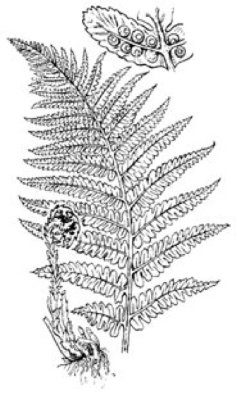 Wurmfarn (Dryopteris filix-mas), unten links unterer Teil der Pflanze, oben rechts Fiederchen mit Sori