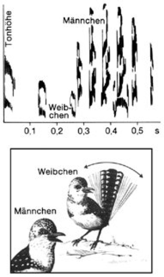 Duettgesang [von ital. duetto = Zwiegesang], Lautäußerungen zweier Individuen, die zeitlich und klanglich aufeinander abgestimmt sind, d. h., bei denen jeder Partner auf die Laute des anderen nach festen Regeln reagiert. Duettgesang wird hauptsächlich von den Sexualpartnern in Monogamie lebender Tiere gezeigt, die sich durch akustische Signale verständigen, z. B. von Singvögeln und einigen Nichtsingvögeln ( vgl. Abb. ), von Gibbons, Spitzhörnchen und (ohne Paarbindung) sogar von Feldheuschrecken. Die Funktion der Duette ist unklar und wahrscheinlich von Art zu Art verschieden. Häufig wird ein synchronisierender Effekt und ein besserer Zusammenhalt der Partner vermutet. Dementsprechend tritt Duettgesang oft bei Tieren auf, die in den Tropen in dichter Vegetation leben und wo eine feste Jahresperiodik fehlt. Daneben könnte der Duettgesang dem Erkennen des Partners oder der Markierung des Reviers dienen. Gesang.