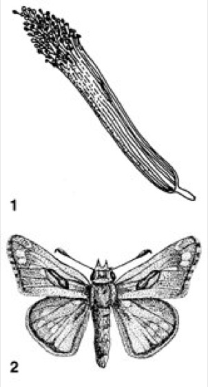1 Duftschuppe eines Perlmutterfalters; 2 Kommafalter (Hesperia comma) mit dem namengebenden deutlichen Duftschuppenfleck auf den Vorderflügeln des Männchens