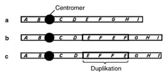 Duplikation w [von latein. duplicatio = Doppelung], Ergebnis einer Chromosomenaberration (Chromosomenmutation), wobei ein Chromosomensegment mit allen darin enthaltenen Genen im haploiden Chromosomensatz zweimal auftritt. Je nachdem, ob die duplizierten Segmente in einem oder in verschiedenen Chromosomen vorliegen, kann zwischen intrachromosomalen und interchromosomalen Duplikationen unterschieden werden ( vgl. Abb. ). Duplikationen können in der Diplophase (Diploidie) homo- oder heterozygot vorliegen. Ob sich eine bestimmte Duplikation für den Trägerorganismus günstig oder ungünstig auswirkt, hängt von ihrer Größe, den qualitativen Eigenschaften der durch sie überzählig im Genotyp vorhandenen Gene und der Auswirkung der durch sie bedingten quantitativen Verschiebungen im Gesamtgenbestand ab. Mutation.