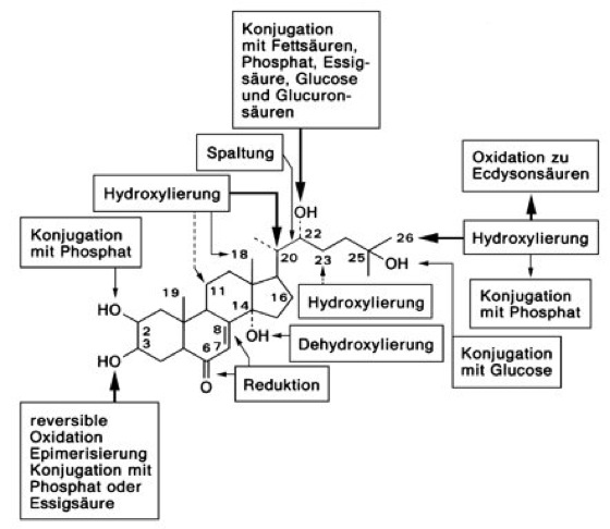 Ecdysteroide, Ecdyson und zahlreiche davon abgeleitete Substanzen, die im Tierreich (Zooecdysteroide) als Hormone und im Pflanzenreich (Phytoecdysteroide) als sekundäre Inhaltsstoffe (Pflanzenstoffe) vorkommen. Der Name leitet sich von der Funktion als Häutungshormon der Insekten ab (Ecdysis, Häutung; Insektenhormone) – eine der vielfältigen Funktionen der Ecdysteroide, welche als erste nachgewiesen wurde. 1954 wurde Ecdyson durch A.F.J. Butenandt und P. Karlson aus 500 kg Puppen des SeidenspinnersBombyx mori erstmals isoliert, die Strukturaufklärung erfolgte 1963 mit Hilfe der Röntgenstrukturanalyse. Bis heute sind weit mehr als 100 Ecdysteroide ( vgl. Abb. ) bekannt, die sich mittels Calliphora-Test (Calliphora-Einheit), Radioimmunassay, HPLC und Massenspektroskopie (Massenspektrometrie) differenzieren lassen. Grundgerüst der Ecdysteroide ist ein Steroid mit einer charakteristischen 14α-Hydroxygruppe und einer 2-enon-Struktur im Ring B, das sich vom Cholesterin ableitet, welches von Arthropoden (Gliederfüßern) nicht selbst synthetisiert werden kann. Die Biosynthese der Ecdysteroide erfolgt in vielen, bis heute noch nicht in allen Details aufgeklärten Schritten über 7-Dehydrocholesterin (Calciferol) und 2,22,25-Trideoxyecdyson (5-β-Ketodiol). Die folgenden, zum Ecdyson führenden Hydroxylierungen werden, nach bisherigen Erkenntnissen, durch von Cytochrom P450 (Cytochrom-P450-System) abhängige Monooxygenasen der Mitochondrien und Mikrosomen (endoplasmatisches Reticulum) katalysiert. Das Ecdyson ist selbst als Hormon wirksam, kann jedoch auch durch Hydroxylierung an C-20 in das aktivere 20-Hydroxyecdyson überführt werden. Ecdysteroide liegen häufig als Konjugate, gebunden an Phosphat, Sulfat, Glucose, Gluconsäuren, Acetat, Fettsäuren oder Proteine, vor ( vgl. Abb. ). Diese Konjugate können zum einen als Speicher-, zum anderen als Ausscheidungsprodukte dienen. Die Inaktivierung der Ecdysteroide erfolgt durch Hydroxylierung an C-26, Bildung von Ecdysonsäuren, Epimerisierung an C-3 sowie durch die Abspaltung der Seitenkette. Ecdysteroide synthetisierende Gewebe sind bei Insekten die Ventraldrüsen im Kopf, Prothoraxdrüse, Ringdrüse, Oenocyten, Hoden und Follikel des Ovars; bei Krebstieren das Y-Organ (Carapaxdrüse) und in anderen Gliederfüßern, z. B. Opilioniden (Weberknechten), oenocytenähnliche Zellkomplexe. Die Synthese der Ecdysteroide wird bei Insekten durch das prothorakotrope Hormon, Juvenilhormon, Ecdysteroid-Feedback und möglicherweise neuronal reguliert. Bei Krebstieren erfolgt die Regulation über das moult inhibiting hormone (MIH), Ecdysteroid-Feedback und möglicherweise über weitere, nicht näher charakterisierte humorale Faktoren. Aufgrund ihrer Polarität können Ecdysteroide als freie, gelöste Substanzen transportiert werden, jedoch existieren auch Ecdysteroid-Carrier-Proteine (ECP), die die Funktion des Transports und der Abpufferung des Ecdysteroid-Titers ausüben können. Die Lipidlöslichkeit ermöglicht die Aufnahme der Ecdysteroide in die Zellen durch Diffusion. Die Akkumulation in bestimmten Geweben (z. B. Imaginalscheiben) wird durch energie- und Na+/K+-ATPasen-abhängige, membranständige Carrier erreicht. Es existieren zumindest zwei verschiedene Typen von Ecdysteroidrezeptoren, cytosolische und kernständige, die in vielen spezifischen Zielorganen mit Hilfe immuncytochemischer Methoden oder durch Bindung des radioaktiv markierten Ecdysteroidagonisten Ponasteron A nachgewiesen werden konnten und welche zwischen einzelnen Ecdysteroiden unterscheiden (relative Molekülmassen zwischen 70 000 beim FlußkrebsOrconectes und ca. 130 000 bei Drosophila, KD zwischen 3,3–6 · 10–9 M bei Drosophila und 5–6 · 10 –11 M bei Orconectes für Ponasteron A). Das Gehirn von Insekten weist eine ganze Reihe Ecdysteroid-bindender Regionen auf. Das Wirkungsspektrum der Ecdysteroide ist sehr breit. Bei Insekten werden die Oocytenreifung, Spermiogenese, Embryonalentwicklung, Larven- und Adulthäutung, Gonadendifferenzierung sowie die Dotterproteinsynthese beeinflußt. Bei der Insektenentwicklung bestimmt das relative Verhältnis von Ecdysteroid zu Juvenilhormon den Häutungstyp (Larval-, Pupal- oder Adulthäutung). Genaue Mechanismen dieser Regulation sind noch weitgehend unbekannt. Der Titer von Ecdyson selbst ist beim Übergang vom Larven- zum Puppenstadium sowie während der Puppenentwicklung am höchsten. Während der Metamorphose von der Larve zur Puppe aktiviert Ecdyson 6 Gene, deren Produkte zum Puppenstadium führen. Ecdyson beeinflußt den an der Häutung maßgeblich beteiligten Tyrosinstoffwechsel, indem es eine Dipeptidase induziert, die β-Alanyltyrosin in Alanin und Tyrosin spaltet. Dieses wird unter hormonellem Einfluß von Bursicon zu Dihydroxyphenylalanin (DOPA) umgebaut, das wiederum von einer durch Ecdyson induzierten DOPA-Decarboxylase zu Dopamin decarboxyliert wird. Im adulten Insekt ist Ecdyson vermutlich an der Induktion von Vitellogenese und Eireifung beteiligt. Verhaltensänderungen, wie das Beenden der Freßphase und das Eintreten in die Wanderphase, ebenso wie das Spinnen des Kokons, werden ebenfalls durch Ecdysteroide induziert. Abhängig vom Entwicklungsstadium werden durch Ecdysteroide unterschiedliche Gene aktiviert, wie z. B. die Regionen 2B5, 74EF und 75B der Riesenchromosomen in Speicheldrüsenzellen während der frühen Larvalentwicklung oder das Ddc-Gen der DOPA-Decarboxylase. Weitere Ecdysteroid-induzierbare Gene sind das 67B-Hitzeschock-Gen, die Actin-Gene 5C und 42A, das Dotterprotein YP1 und viele andere. Die weitaus umfangreichsten Kenntnisse der Ecdysteroidwirkung stammen zwar aus dem Bereich der Insekten, die hormonelle Regulation durch Ecdysteroide ist aber für alle Gliederfüßer nachgewiesen. Auch bei Hohltieren, Plattwürmern, Fadenwürmern, Ringelwürmern und Weichtieren treten Ecdysteroide auf, bei manchen dieser Tiere ist die Hormonwirkung gezeigt oder wird zumindest vermutet. Daher werden die Ecdyst