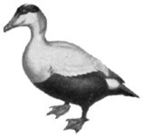 Eiderente, Somateria mollissima, ca. 60 cm großer, holarktisch verbreiteter Entenvogel der Meeresküsten; Männchen unverkennbar mit schwarzem Bauch und weißem Rücken ( vgl. Abb. ), grünliche Färbung im Genick wird (als Ausnahme unter den Entenvögeln) nicht durch Federstrukturen, sondern ein grünes Lipochrom erzeugt; Weibchen dunkelbraun, gebändert; junge Männchen sind im Übergangskleid gescheckt und erinnern an Bastardenten. Gutes Tauchvermögen, auch bei rauher See; animalische Nahrung der Küstengewässer, vor allem Mollusken. Brütet in Mitteleuropa kolonieweise an der Nord- und Ostseeküste und bevorzugt kleine vorgelagerte Inseln; das Nest wird mit wärmeisolierenden Dunenfedern ausgepolstert (Farbtafel Entenvögel II). Der Bestand ging durch Einsammeln von Dunen (Eiderdaunen) und Eiern in weiten Teilen des Brutareals stark zurück, erholte sich durch strenge Schutzmaßnahmen nach dem 2. Weltkrieg. Ziehende Eiderenten fliegen in langen Ketten dicht über der Wasserfläche; sie erscheinen in geringer Zahl auch auf binnenländischen Seen und Flüssen (Farbtafel Europa I). Die hochnordische Prachteiderente (Somateria spectabilis) ist mehr oder weniger regelmäßiger Wintergast der Küstengewässer. Polarregion III.