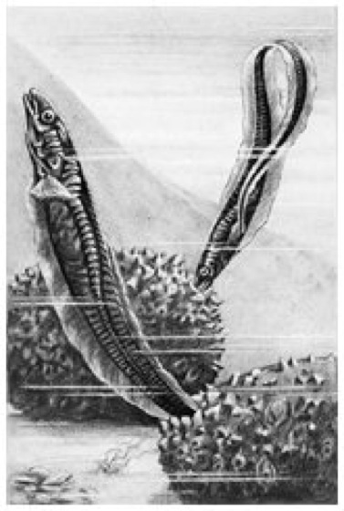 Eingeweidefische, Ophidioidei, nach älterer Systematik eine Unterordnung der Dorschfische mit 2 Familien und zahlreichen Gattungen; sie bilden neuerdings mit weiteren 3 Familien der Brotuliden eine eigene Ordnung Eingeweidefischartige (Ophidiiformes) mit insgesamt 355 Arten. Eingeweidefische sehen aalähnlich aus; so haben sie einen durchgehenden Flossensaum vom Vorderrücken über den Schwanz bis zum After, einen kleinen Kopf und – wenn vorhanden – kehlständige weichstrahlige Bauchflossen. Die ca. 30 cm langen, schleimfischartigen, weltweit verbreiteten Schlangenfische (Ophidiidae) mit 46 Gattungen und 209 Arten sind durchweg Bodenbewohner von der Tiefsee bis ins Süßwasser. Einige Arten schlüpfen mit dem Schwanz voraus in Spalten. Das 30 cm lange großäugige Bartmännchen (Ophidion barbatum) kommt im Ostatlantik, Mittelmeer und Schwarzen Meer vor; es hat am Kinn stehende, bartelartig auf wenige fädige Flossenstrahlen reduzierte Bauchflossen. Fischereiwirtschaftlich bedeutend ist der bis 1,5 m lange Genypterus capensis, der in Tiefen von 50–450 m um Südafrika verbreitet ist. Meist in warmen Meeren kommen die bis 20 cm langen Eigentlichen Eingeweidefische oder Nadelfische (Carapidae) mit 7 Gattungen und 32 Arten vor. Sie leben in Körperhöhlen von Seegurken, anderen Stachelhäutern, Manteltieren und Muscheln, in die sie rückwärts einschlüpfen und diese nur zur Nahrungssuche und Fortpflanzung verlassen. Ihre Afteröffnung liegt vorn an der Kehle, Bauchflossen fehlen. Bekannt ist vor allem die Art Carapus (= Fierasfer) acus ( vgl. Abb. ) aus dem Mittelmeer, die parasitisch in Seegurken lebt und sich von den Gonaden ihres Wirts ernährt.