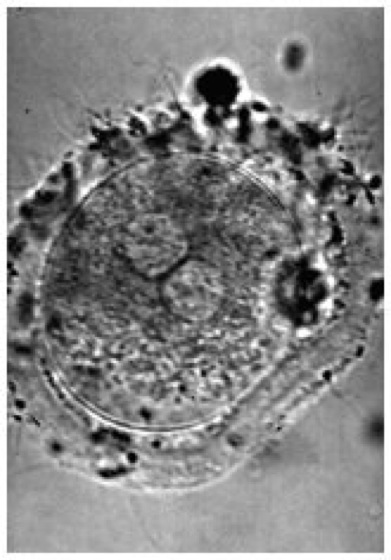 Lichtmikroskopische Aufnahme einer besamten Eizelle des Menschen mit Vorkernen (in Zellmitte), umgeben von einer dicken Zona pellucida.