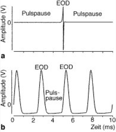 Organ-Entladungsmuster von a Pulsfischen (Gnathonemus) und b Wellenfischen (Eigenmannia). Bei Pulsfischen sind die Pulspausen sehr lang, die EODs selber kurz; bei Wellenfischen sind die Pulspausen nie länger als zwei EODs.