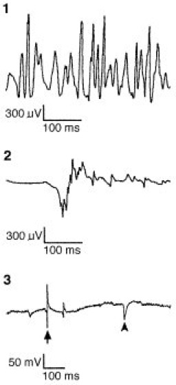 1 normales Muster, 2 Muster bei Nervenläsion, 3 pathologische Spontanaktivität mit Fibrillationspotential (Pfeil) und positiver scharfer Welle (Pfeilspitze)