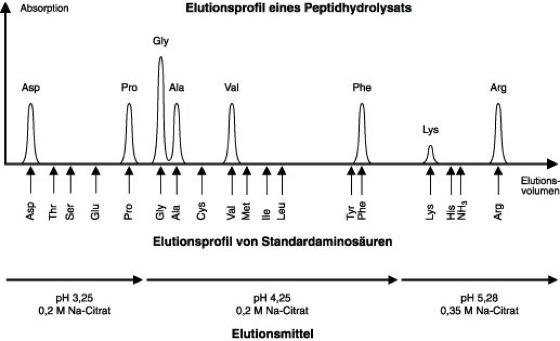 Bei der Auftrennung eines Peptidhydrolysats auftretendes Elutionsprofil. Die an die Säule (sulfoniertes Polystyrol) adsorbierten Aminosäuren wurden mit 3 verschiedenen Puffern