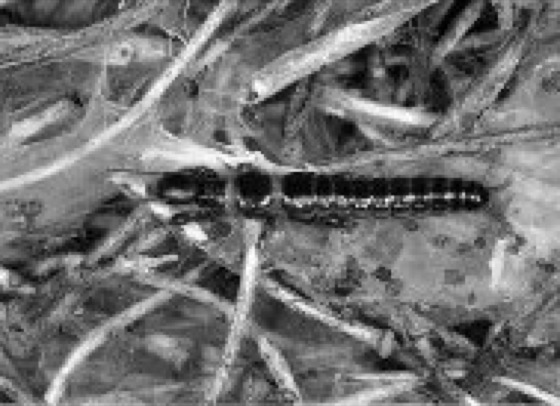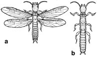 Embioptera [Embien, griech. pteron = Flügel], Embioidea, Embien, Fersenspinner, Fußspinner, Spinnfüßer, Ordnungder Insekten. In Europa kommen im Mittelmeerraum einige der insgesamt etwa 200 Arten vor, das Hauptverbreitungsgebiet liegt in den Tropen und Subtropen. Die Fersenspinner sind bis 20 mm große, schlanke, braun bis schwarz gefärbte Insekten. Der ovale, nach allen Seiten bewegliche Kopf trägt primitive, kauende Mundwerkzeuge, die Antennen sind perlschnurartig aus ca. 20 Gliedern aufgebaut. Stirnaugen sind nie vorhanden, aber ein Paar kleiner Komplexaugen. Der aus 3 gleichartigen Segmenten bestehende Thorax trägt bei Weibchen keine, bei Männchen mancher Arten 2 Paar Flügel ( vgl. Abb. ), die unabhängig voneinander bewegt werden können. Die ersten Tarsalglieder der Vorderbeine sind stark vergrößert und verdickt und tragen je etwa 100 Spinndrüsen (Name), die einzeln in hohle Haare münden. Die Fersenspinner legen damit unter Steinen oder Rinde schlauchförmige Gespinste an, in denen sie leben und überwintern ( vgl. Abb. ). Die Weibchen leben von Pflanzen, die sie benagen, die Männchen auch räuberisch. Die ca. 200 Eier werden in das Wohngespinst gelegt und bei manchen Arten vom Weibchen bewacht. Die Entwicklung der Larven ist unvollständig (Hemimetabolie; Hemimetabola); sie häuten sich 4mal; das letzte Larvenstadium macht vor dem Schlüpfen der Imago keine Ruhepause durch.