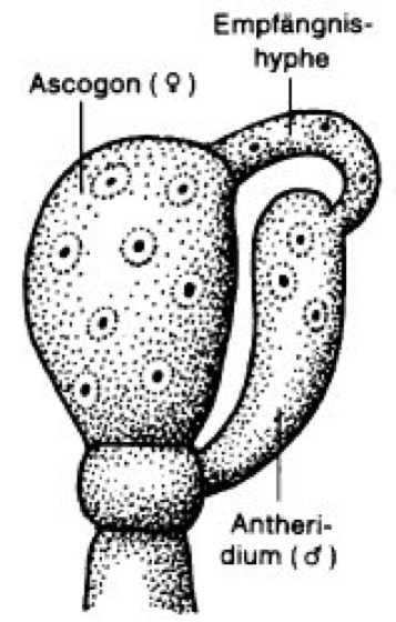 Gametangie eines homothallischen Schlauchpilzes (Pyronema) mit Empfängnishyphe