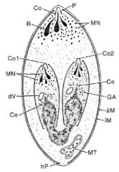 äM äußere Membran der Cuticula, Ce Centriol, Co Conoid, dV dickwandige Vesikel, GA Golgi-Apparat, hP hinterer Polring, iM innere Membran der Cuticula, MN Microneme, MT Mitochondrium, P Polring, R Rhoptrien (paariges Organell)