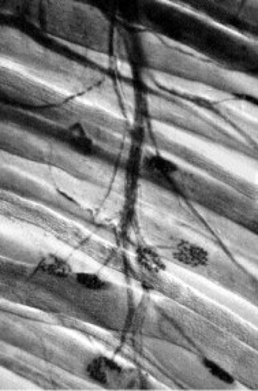 Lichtmikroskopische Aufnahme von neuromuskulären Verbindungen (Motoneuron–Muskelzelle) über motorische Endplatten