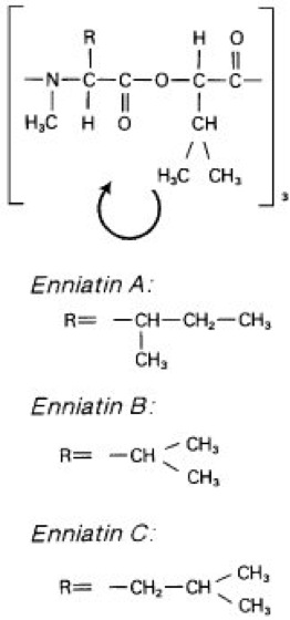 Der gekrümmte Pfeil deutet an, daß sich die drei strukturellen Einheiten zu einem Ring schließen. Aufgrund ihrer hohen Säuger-Toxizität sind Enniatine pharmakologisch ohne Bedeutung.