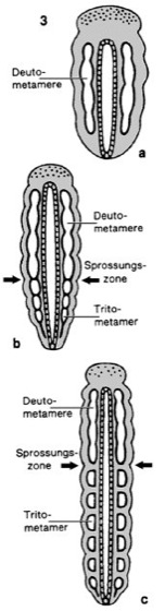 3 a–c Bildung der Tritometameren durch seriale Differenzierung aus einer Sprossungszone caudal von den Pfeilen.