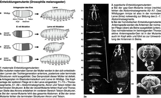 Entwicklungsmutantew [von latein. mutans = sich verändernd], Lebewesen, dessen Ontogenese (Entwicklung) infolge von Gen-Mutation abnorm verläuft. Befindet sich das mutierte Gen im betreffenden Organismus selbst, spricht man von zygotischen Entwicklungsmutanten, so z.B. bei der Fruchtfliege Drosophila melanogaster bei einer Mutation des gap-Gensknirps oder bei einer Mutation des homöotischen Antennapedia-Gens (Antennapedia-Komplex; vgl. Abb. ). Liegt die Mutation im Genom der Mutter, dann kann diese abnorme Eizellen bilden, aus denen abnorme Embryonen entstehen, selbst wenn deren Genom das normale Gen enthält. Beispiele für solche maternale Entwicklungsmutanten sind die bicoid-Mutante (bicoid), bei der von der Mutter keine oder fehlerhafte bicoid-mRNA im vorderen Eipol deponiert wird (Lokalisierung von mRNA), so daß im Embryo Kopf und Thorax nicht gebildet werden, oder die nanos-Mutante (nanos), bei der das Abdomen nicht gebildet wird ( vgl. Abb. ). Die genaue Untersuchung solcher Entwicklungsmutanten ermöglicht es, die Funktion der entsprechenden normalen Gene während der Entwicklung zu erschließen. – Entwicklungsmutanten lassen sich in verschiedene Klassen einteilen: 1) Es kann der Bauplan (Anlageplan, Abb.) als solches unverändert sein, jedoch sind einzelne Bereiche innerhalb dieses Bauplans gestört. In diese Klasse fallen die meisten der milderen Entwicklungsmutanten, wie etwa die homöotischen Mutanten. Hier wird ein Organ zwar am richtigen Ort, aber mit der falschen Identität gebildet. Bei der Fruchtfliegen-Mutante Antennapedia entwickelt sich z.B. ein Bein an dem Ort, wo gewöhnlich eine Antenne entsteht; bei der Löwenmäulchen-Mutante deficiens sind die Kronblätter durch Kelchblätter und die Staubblätter durch Fruchtblätter ersetzt. 2) Es kann jedoch auch der gesamte Bauplan eines Organismus verändert sein. Solche Mutanten sind meist nicht lebensfähig. Hier handelt es sich oft um Störungen in der Entstehung von Körper-Achse und Polarität. Die Mutanten bicoid und nanos der Fruchtfliege zeigen eine Störung der Kopf-Schwanz-Polarität, bei der Mutante dorsal (dorsal-Gen) ist die Unterscheidung Rücken–Bauch betroffen, bei der Mausmutante situs inversus wird die Links-Rechts-Asymmetrie bestimmter Körperorgane wie Herz und Blinddarm nicht mehr korrekt gesteuert. Die mutierten Gene sind oft Transkriptionsfaktoren. Im Gegensatz dazu betreffen alle bislang aufgeklärten Mutationen von Achse und Polarität bei Pflanzen die korrekte Ausrichtung von innerzellulären Transportvorgängen. Bei der Arabidopsis-Mutante (Schmalwand) gnom ist ein sekretorisches Protein mutiert, das für die asymmetrische Teilung der Zygote notwendig ist, so daß keine Sproß-Wurzel-Polarität ausgebildet wird. Bei der Mutante knolle ist der gerichtete Transport von Vesikeln zur Zellplatte verändert, was zum Ausfall eines ganzen Gewebes, der Epidermis, führt. Bei der wurzellosen Mutante monopteros ist der polare Fluß des Pflanzenhormons Auxin (Auxine) vermindert, was Störungen im Muster der Leitbündel hervorruft. Embryonalentwicklung, Entwicklungsbiologie (Geschichte der), maternale Determinanten, Musterbildungsgene, Polplasma, Prädetermination.