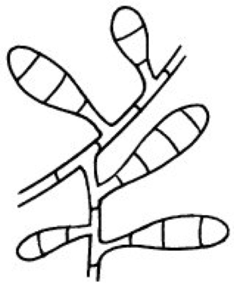Makrokonidien (2–6 Zellen) von Epidermophyton floccosum (Mikrokonidien werden nicht gebildet)