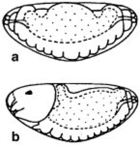 Epigenetische Information bei einem Insekten-Ei. Nach experimenteller Störung eines Cytoplasmabezirks im Vorderpol der Eizelle bildet die vordere Eihälfte (links) einen zweiten Hinterleib (a) statt Kopf und Bruststück des normalen Embryos (b).