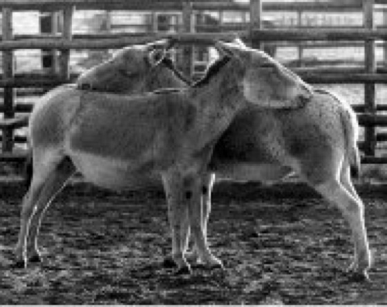 Wechselseitiges Belecken (ritualisiert; nur in bestimmten Körperregionen) beim Onager (Persischer Halbesel, Equus hemionus onager)