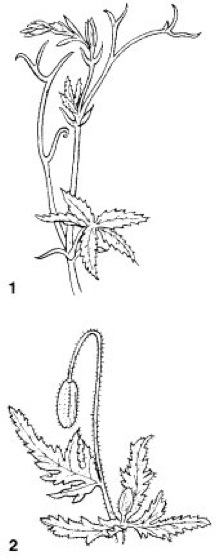 1 Epinastie der Sproßspitze beim Wilden Wein (Parthenocissus quinquefolia),2 Epinastie der Knospe beim Klatsch-Mohn (Papaver rhoeas)