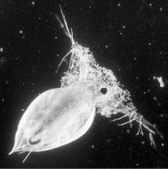 Antennen und Kopf dieses Wasserflohs sind dicht mit epizoischen Wimpertierchen besetzt.