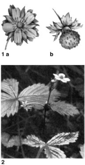 1Fragaria spec.,a Blüte, b Frucht; 2 Wald-Erdbeere (Fragaria vesca)