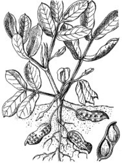 Erdnuß (Arachis), Pflanze mit Blüten und Früchten in verschiedenen Entwicklungsstadien, rechts unten Hülse im Längsschnitt
