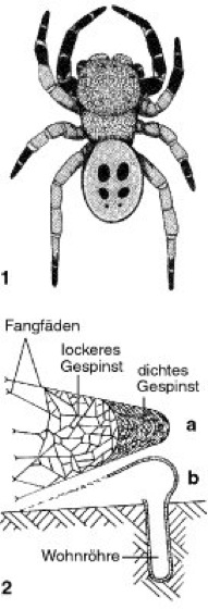 Eresusm [von griech. erethein = reizen], Gattung der Röhrenspinnen, die mit einer einzigen Art (Eresusniger = Eresus cinnabarinus) in Mitteleuropa vorkommt (selten, im Mittelmeerraum häufig). Die Männchen ( vgl. Abb. ) sind 8–14 mm groß und durch ihre hellrote Hinterleibsfärbung mit 4 großen schwarzen Punkten auffällig (Warnfarbe, bei Reizung wird der Hinterleib hochgestellt und bewegt). Sie laufen in den Spätsommermonaten auf der Suche nach Weibchen herum, die sich zeitlebens in einer Gespinströhre aufhalten (Weibchen vollkommen schwarz gefärbt). Begattung und Aufzucht der Jungen finden in der Röhre statt. Das Eigelege und das Weibchen überwintern. Im nächsten Frühjahr wird das Gelege häufig an die Sonne getragen. Die Jungspinnen werden Mund zu Mund gefüttert (Regurgitation). Das Fanggewebe besteht aus vielen Stolperfäden, die vom überdachten Röhreneingang ausgehen ( vgl. Abb. ) und mit Cribellumwolle belegt sind. Die Beute ist meist auf hartschalige Käfer beschränkt. soziale Spinnen.
