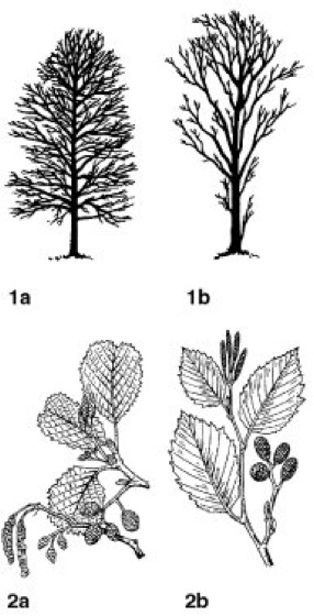 1a Schwarz-Erle (Alnus glutinosa),1b Grau-Erle (Alnus incana);2a Blütenkätzchen und junge Zapfen der Schwarz-Erle, 2b der Grau-Erle