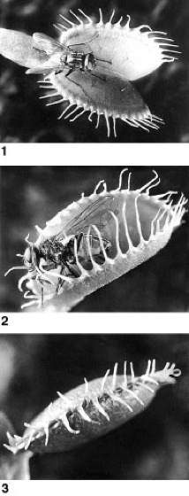 1 Eine Fliege hat sich auf ein Blatt der Venusfliegenfalle (Dionaea muscipula) gesetzt; beim Vorwärtskrabbeln berührt sie eines der Sinneshaare. 2 Nachdem das Insekt das Sinneshaar berührt hat, klappt das Blatt zusammen. 3 Das zusammengeklappte Blatt umschließt das Insekt; die Verdauungsdrüsen sondern ein Sekret ab, das zur Auflösung des Tieres führt; dieser Vorgang dauert etwa 1 Woche.