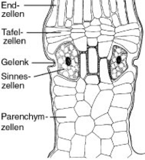 Sinnesborste der Venusfliegenfalle. Die Verbiegung der Borste durch ein Insekt wird durch die relativ starren Endzellen auf die Tafelzellen übertragen und führt zu einer Verformung der Sinneszellen, die im Gelenk der Borste sitzen. Von dort wird ein noch unbekanntes Signal durch die Parenchymzellen zum motorischen Gewebe in der Mittelrippe des Blatts geleitet und gespeichert.