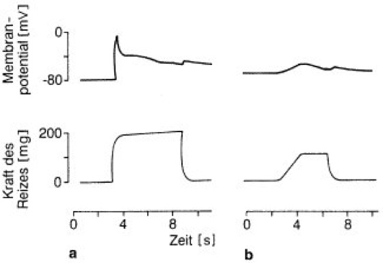 Änderungen des Membranpotentials (oben) einer Sinneszelle der Venusfliegenfalle (Dionaea muscipula) nach Ausübung (unten) von starkem (a) bzw. schwachem (b) Druck