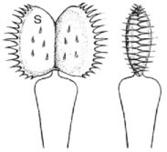 Blatt der Venusfliegenfalle im geöffneten Zustand (links) mit den Sinnesborsten (S) in der Blattspreite, daneben im geschlossenen Zustand. Die Schließbewegung kann in günstigen Fällen binnen von Sekundenbruchteilen ablaufen.